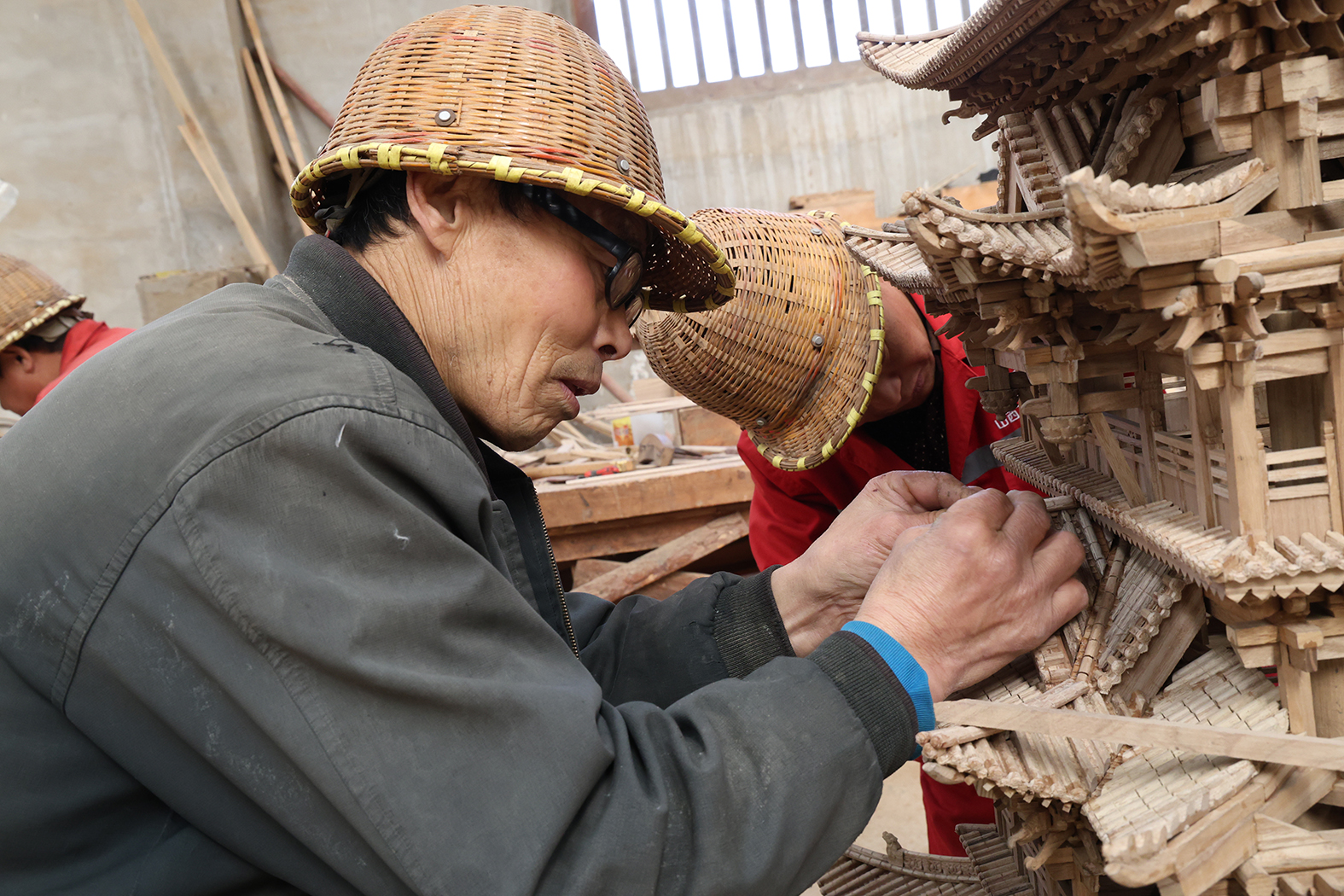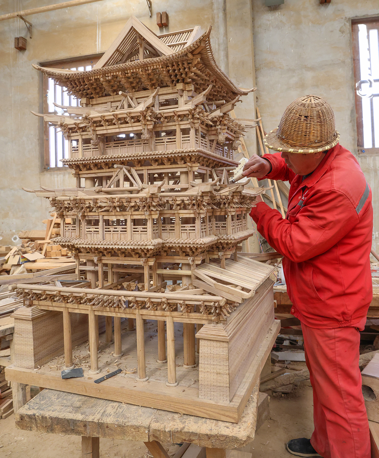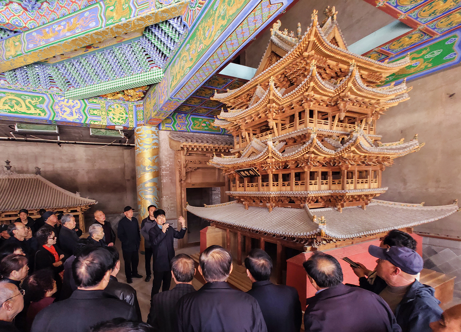 4月3日,运城市万荣县里望乡北阳村的万唐龙古建筑工程有限公司,人们在观赏复刻的大比例飞云楼模型。
