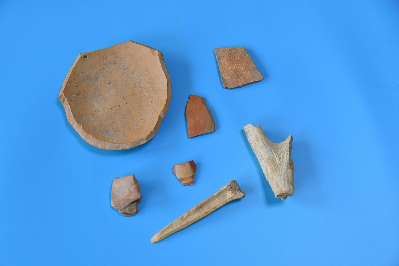 图为在移穣村采集到的骨觿、鹿角及仰韶文化时期红陶片。