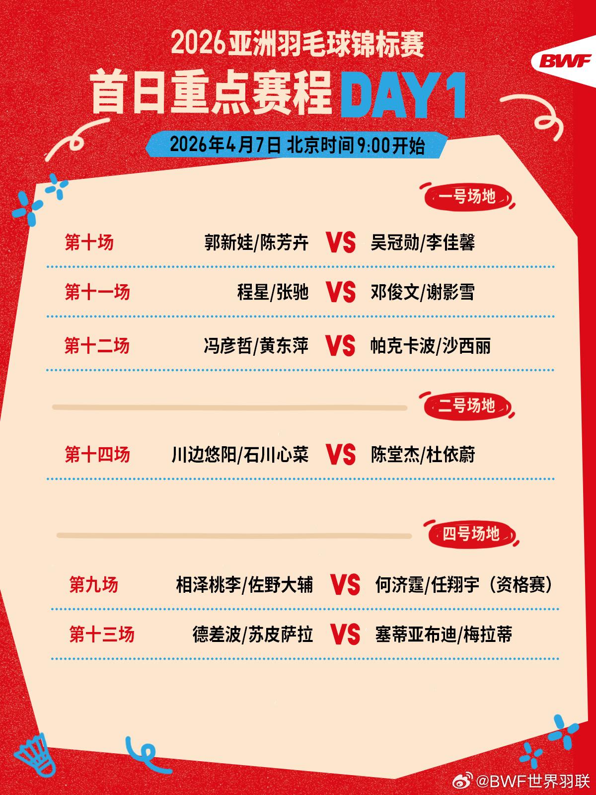 4月7日,2026年亚洲羽毛球锦标赛北京时间9时开打,焦点战:冯彦哲/黄东萍vs帕克卡波/沙西丽、程星/张驰vs邓俊文/谢影雪等。