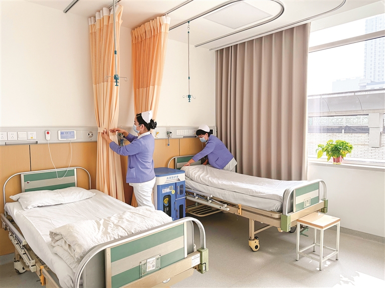 山西省第五人民医院(省老年医院)全面开展病房适老化改造工作,在已完成适老化改造的新病房内,护士们正在进行整理清洁。记者 秦 洋摄