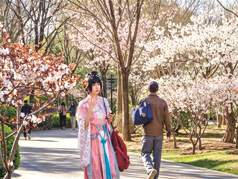 ▶身着汉服的游客在太原迎泽公园中穿行赏花。 王馨苒摄