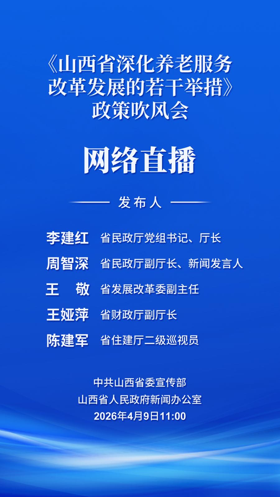 中共山西省委宣传部、山西省人民政府新闻办公室将于2026年4月9日(星期四)上午11时举行《山西省深化养老服务改革发展的若干举措》政策吹风会。省民政厅党组书记、厅长李建红,省民政厅副厅长、新闻发言人周智深,省发展改革委副主任王敬,省财政厅副厅长王娅萍,省住建厅二级巡视员陈建军将介绍有关情况,并答记者问。