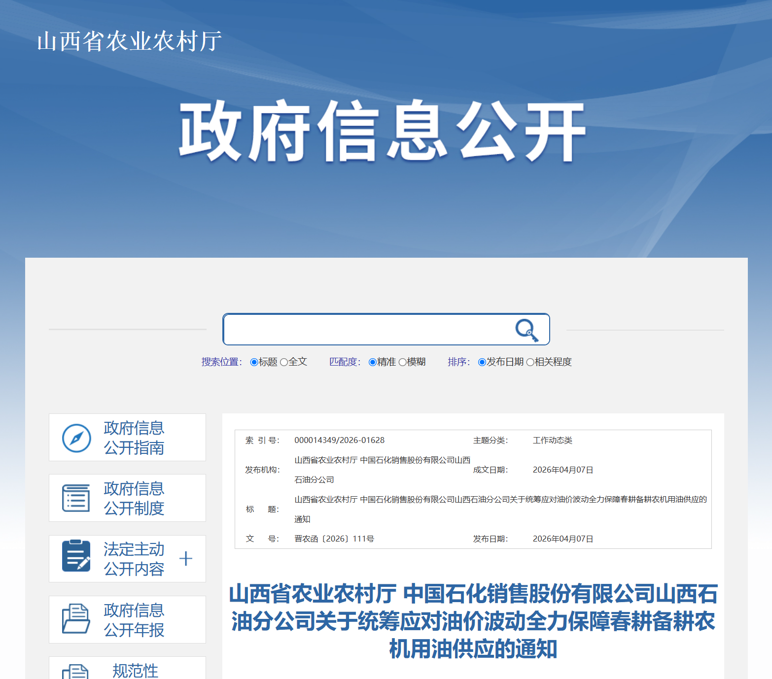 4月7日,记者从山西省农业农村厅获悉,山西省农业农村厅分别与中国石油天然气股份有限公司山西销售分公司、中国石化销售股份有限公司山西石油分公司联合印发通知,统筹应对油价波动,全力保障2026年春耕备耕期间农机用油稳定供应,切实降低农业生产成本,助力粮食生产。