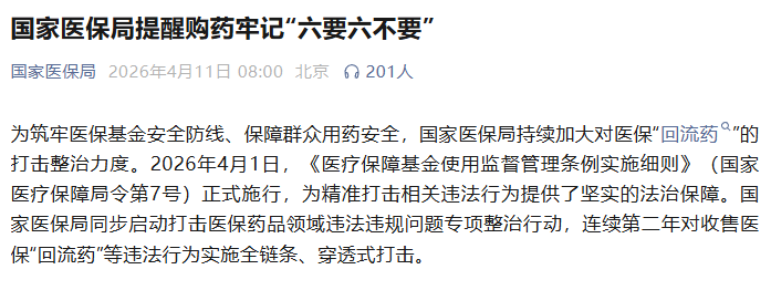 为筑牢医保基金安全防线、保障群众用药安全,国家医保局持续加大对医保“回流药”的打击整治力度。2026年4月1日,《医疗保障基金使用监督管理条例实施细则》(国家医疗保障局令第7号)正式施行,为精准打击相关违法行为提供了坚实的法治保障。国家医保局同步启动打击医保药品领域违法违规问题专项整治行动,连续第二年对收售医保“回流药”等违法行为实施全链条、穿透式打击。