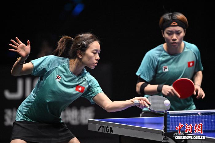 4月12日,WTT常规挑战赛太原站收官,中国香港组合杜凯琹/吴咏琳(左)在女双决赛中。中新社记者 韦亮 摄
