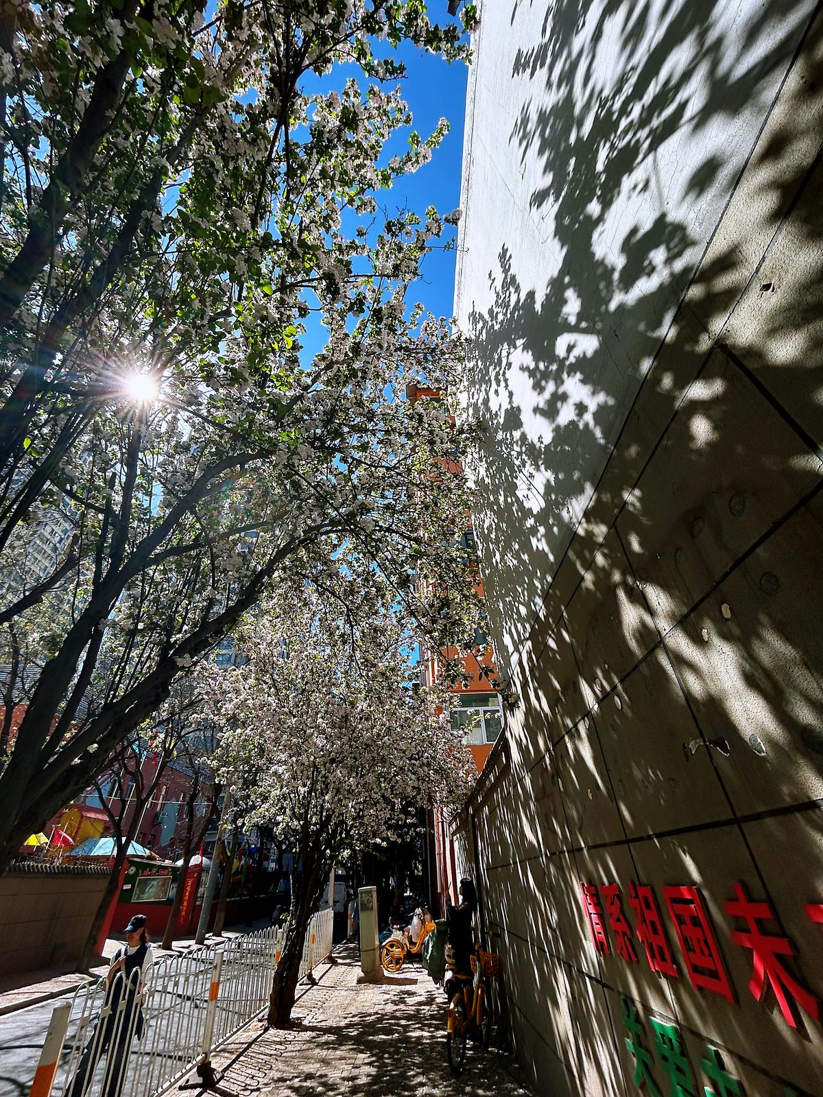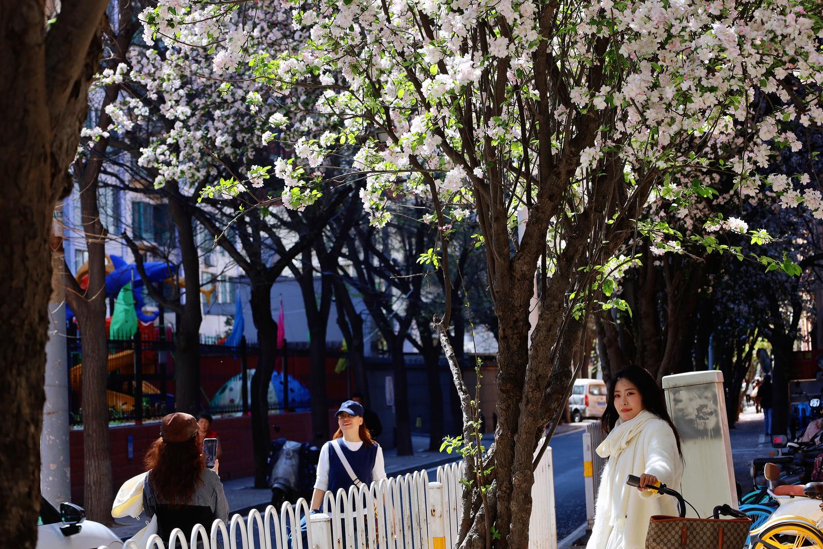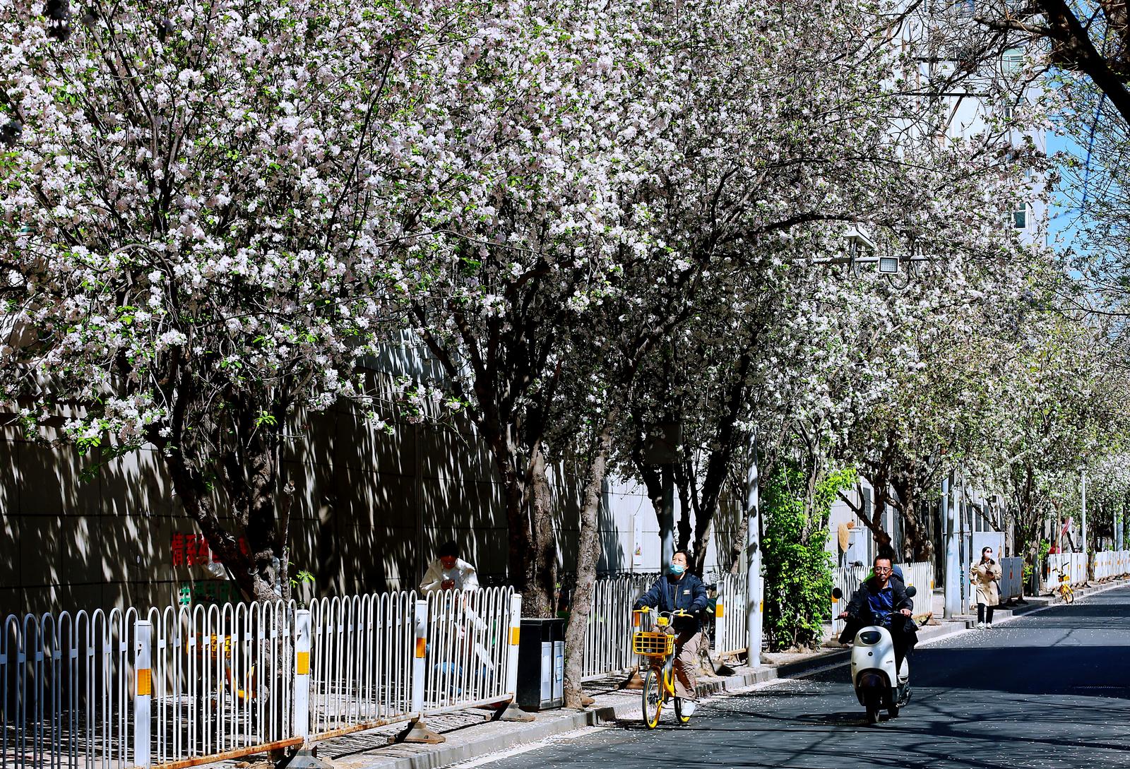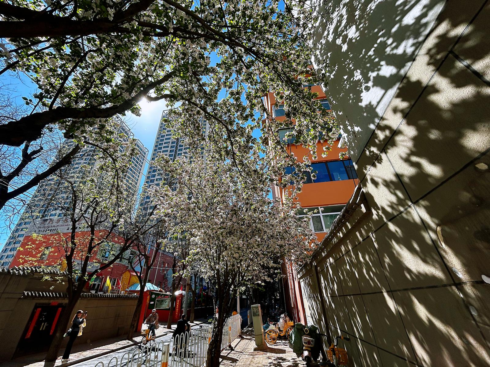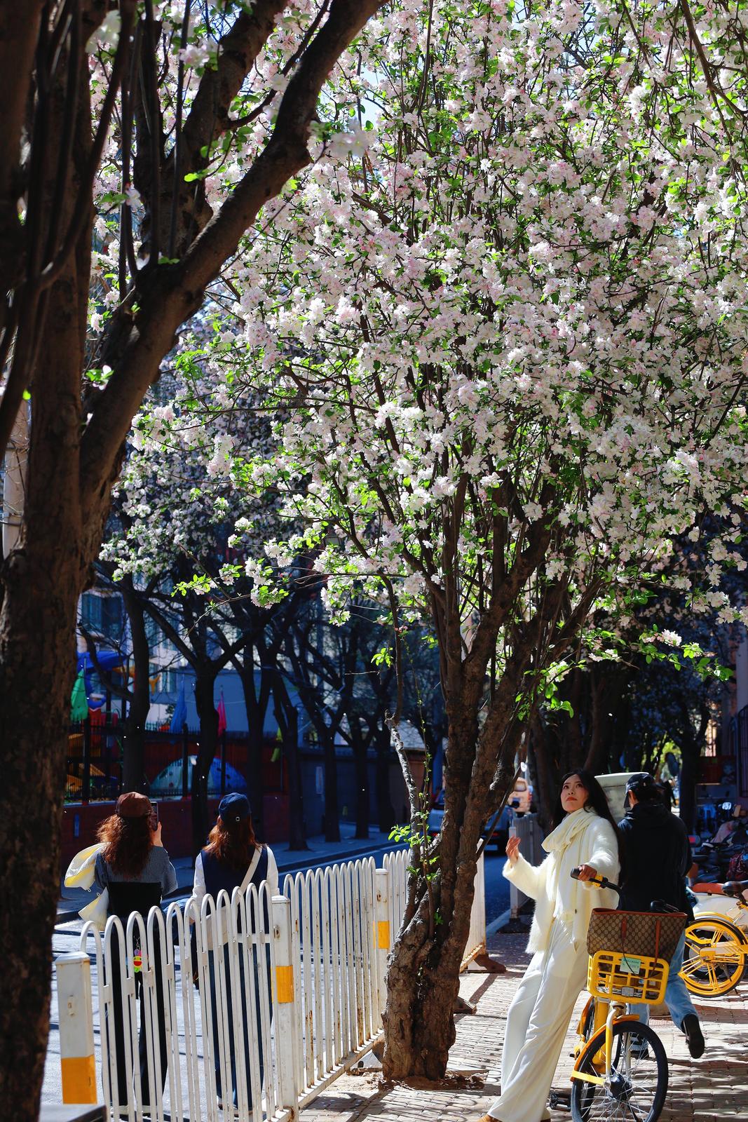 抬头仰望,繁密的花枝在街巷上空交织成穹顶,市民们循着花香而来,或驻足花下定格美好,或骑行穿梭于花影之间,在繁花簇拥中感受春日的温柔。微风轻拂,花瓣为路面铺就一层淡粉花毯,车行其间、人行花下,随手一拍都是满屏电影感,也让每一位途经此处的人,都能在花影间,邂逅城市街巷的鲜活与春日繁花的诗意。