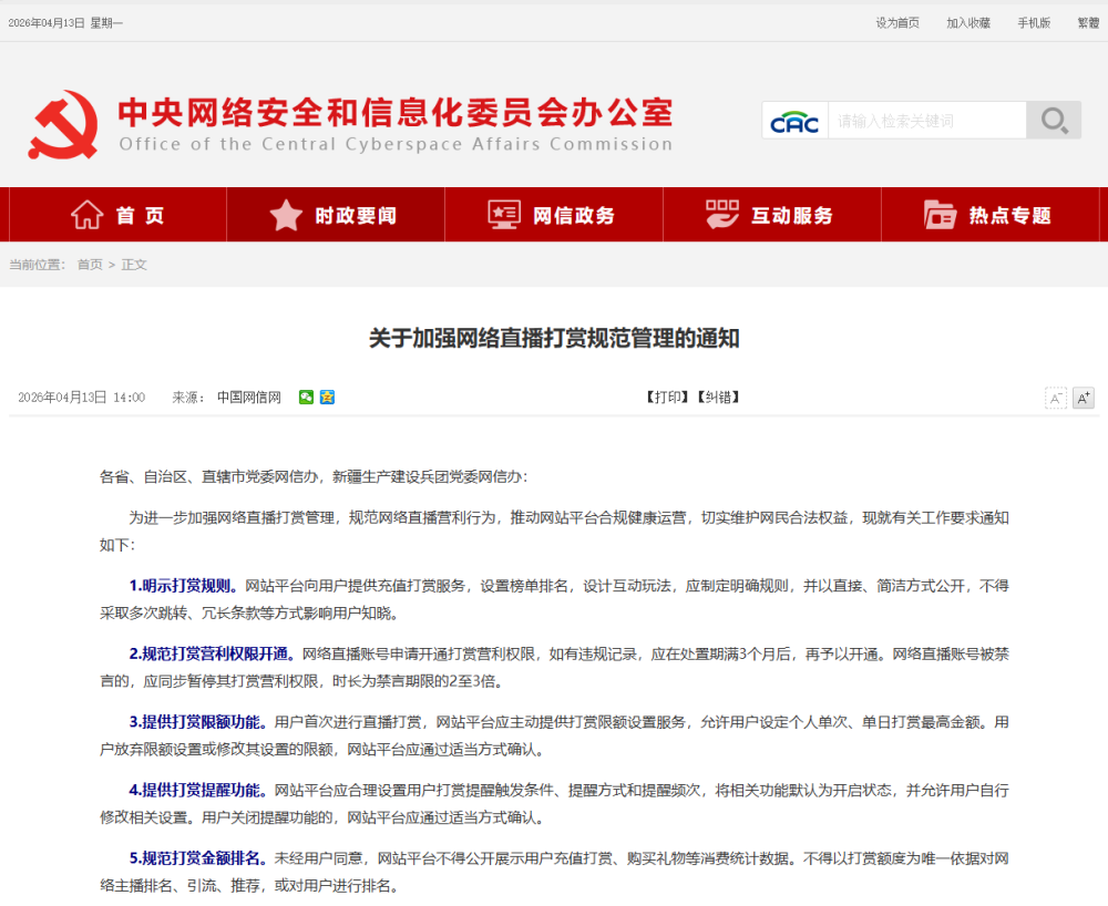 中央网信办发布《关于加强网络直播打赏规范管理的通知》