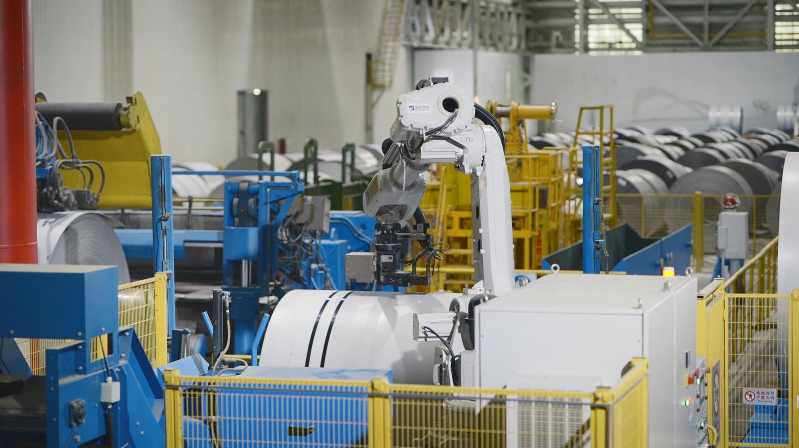 太钢全自动拆捆机器人正对包装带进行拆除作业。图片由太钢提供