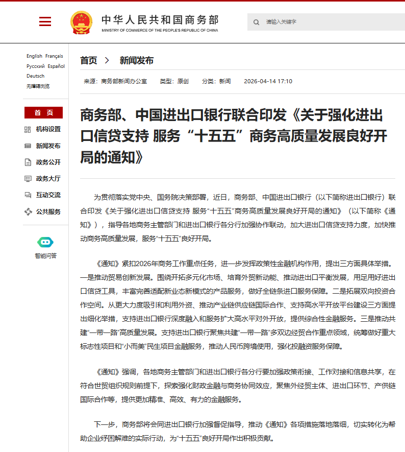 商务部、中国进出口银行联合印发《关于强化进出口信贷支持 服务“十五五”商务高质量发展良好开局的通知》