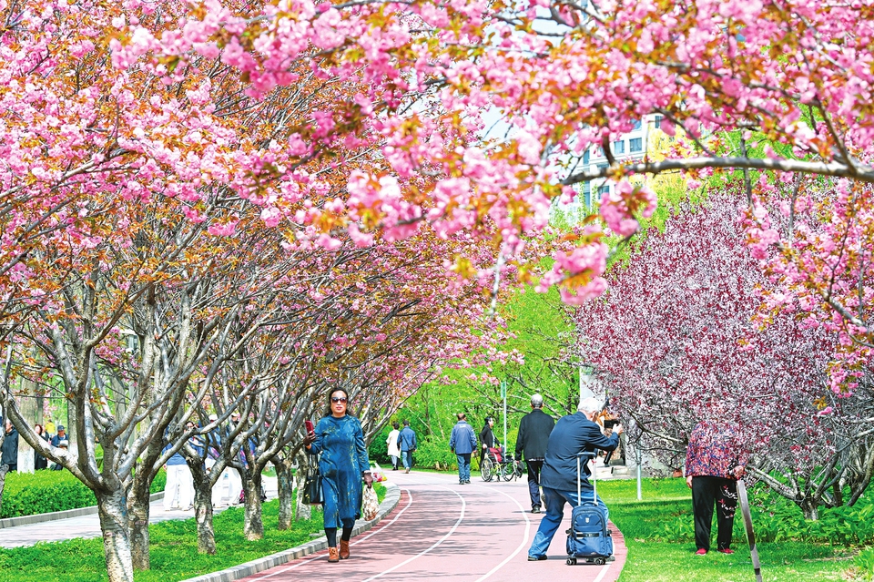 4月13日,太原和平公园内,游人漫步樱花树下踏青游玩、定格美好。近日,园内800余株樱花次第绽放,绵延成一条浪漫的樱花长廊,成为园内春日不可错过的风景。王若渊摄