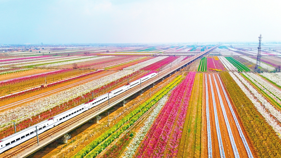 4月4日,运城市盐湖区龙居镇小张坞村,洁白的梨花、粉红的桃花与金黄的油菜花错落铺展,一列高速列车穿行于花海与田野间。此刻,春满三晋,人间正暖。王哲摄