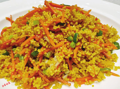 胡萝卜捞小米饭以小米、胡萝卜丝炒制而成,松软鲜香,口感丰富。