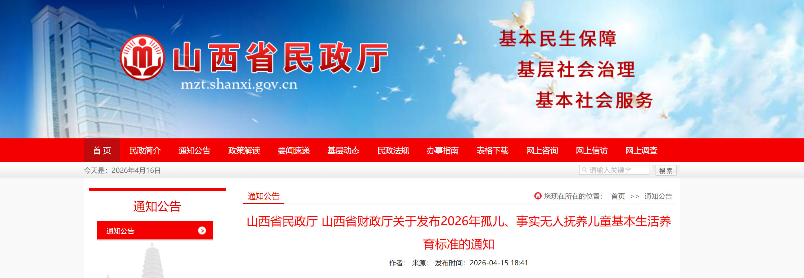 近日,山西省民政厅、财政厅联合下发通知,根据相关规定及山西省居民消费支出情况,调整2026年孤儿、事实无人抚养儿童基本生活养育标准,新标准自2026年1月1日起执行。