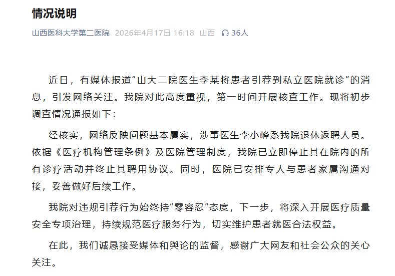 4月17日,山西医科大学第二医院微信公众号,发布《情况说明》,就近日,有媒体报道“山大二院医生李某将患者引荐到私立医院就诊”的消息,引发网络关注,将初步调查情况进行了通报。
