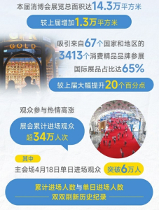 第六届消博会4月13日至18日在海南举行。据消博会主办方介绍,展会累计进场观众超34万人次,其中主会场4月18日单日进场观众突破6万人,累计进场人数与单日进场人数双双刷新历史纪录。