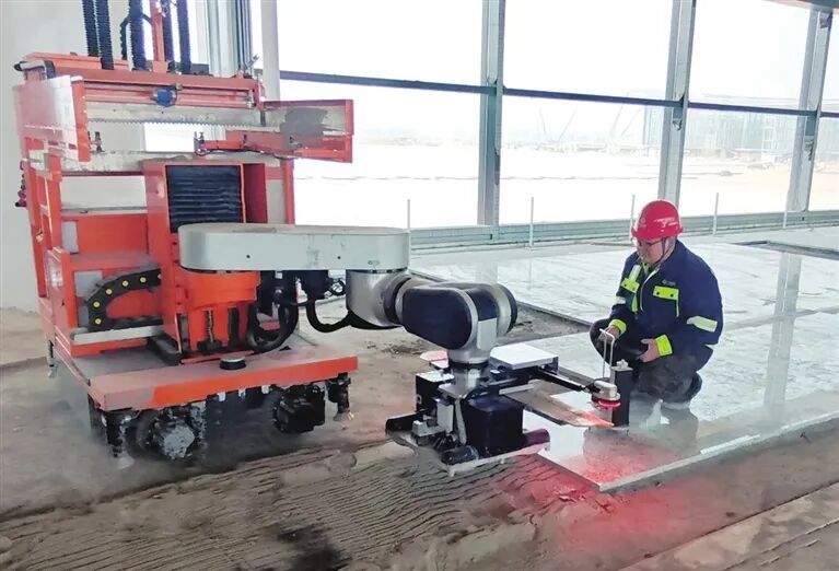 “长期以来,传统地面石材铺贴施工中,人工操作的局限性贯穿施工全过程,是行业长期难以解决的痛点。”现场施工人员介绍,传统工艺主要依赖熟练工人手工完成,每道工序都对工人的技术水平、操作熟练度有着极高要求。通常情况下,一名经验丰富的工人,每日仅能完成约18平方米的石材铺贴任务,生产效率低的问题尤为突出。对于T3航站楼东指廊这类大面积室内装修项目而言,若完全依赖人工铺贴,不仅需要投入大量人力,更可能严重延误施工工期,增加项目整体成本。“人工铺贴普遍存在工效输出不稳定、个体差异大、作业状态波动明显等问题,现场还可能出现违章作业、简化工序、不按标准施工等情况,人为不确定因素多,难以实现标准化、常态化稳定输出。同时,人工铺贴难以保证砖缝宽窄均匀、线条顺直,易出现缝宽不均、观感杂乱等缺陷,且易产生松动、起翘、空鼓等质量问题,平整度与砖边高差难以达标,大面积施工时累计误差会持续放大,无法满足大型公共建筑对装修精度与整体效果的严苛要求。”他说。