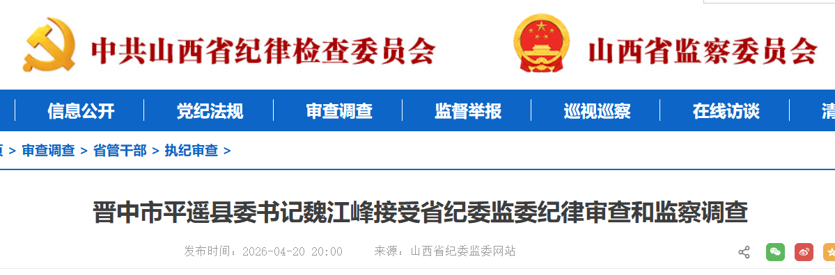 3.晋中市平遥县委书记魏江峰接受省纪委监委纪律审查和监察调查