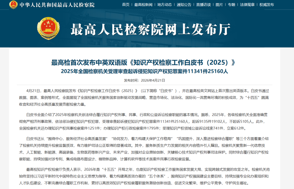 4月21日,最高人民检察院发布《知识产权检察工作白皮书(2025)》(以下简称“白皮书”),并在最高检英文网站上首次推出英语版本。白皮书通过数据、图表、案例等形式,全面展现了全国检察机关服务国家创新驱动发展战略,营造市场化、法治化、国际化一流营商环境的积极成效,为“十四五”圆满收官和经济社会高质量发展贡献检察力量。