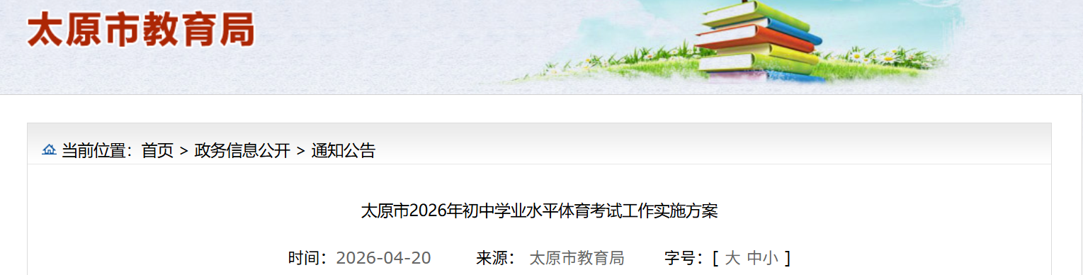 4月20日,太原市教育局发布2026年初中学业水平体育考试工作实施方案(以下简称“方案”),明确考试对象为参加太原市2026年初中学业水平考试的考生,“方案”公布了各县(市、区)的考试时间安排,确定正考自5月8日起分考点有序开展,缓考安排在5月中下旬。