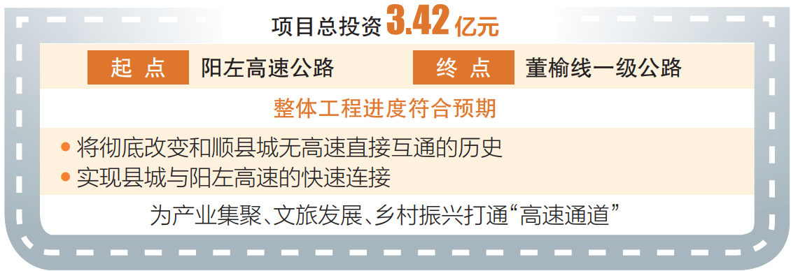 项目位于和顺县义兴镇,总投资3.42亿元,起点阳左高速公路,终点至董榆线一级公路,整体工程进度符合预期,将彻底改变和顺县城无高速直接互通的历史,实现县城与阳左高速的快速连接,为产业集聚、文旅发展、乡村振兴打通“高速通道”。