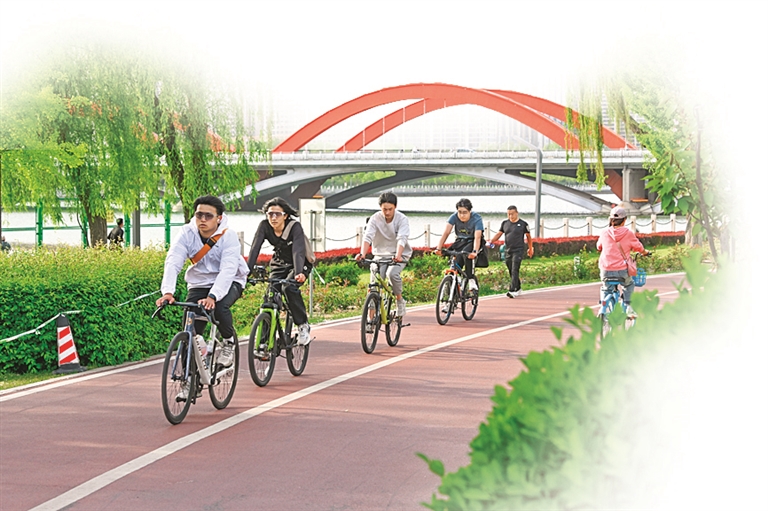 上午10时许,记者从滨河西路一处入口骑行进入自行车道,彩色陶瓷颗粒铺设的路面平整美观,骑行者往来穿梭、惬意悠然。车道一侧,汾河碧波荡漾,绿植郁郁葱葱,水光与绿意相映成趣;另一侧,高楼林立、城景交融,自然生态与都市繁华完美衔接,移步易景的体验令人心旷神怡。