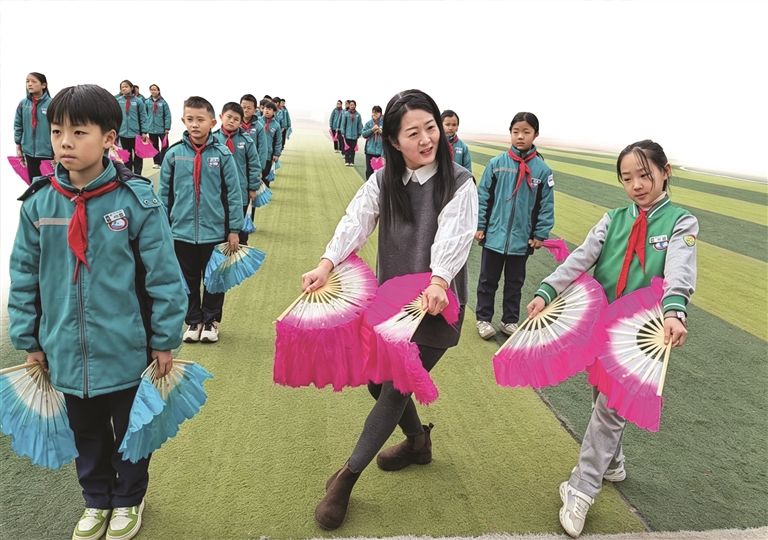 左权县示范小学老师在指导学生花戏操的动作。