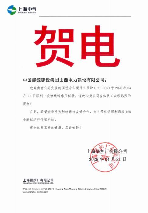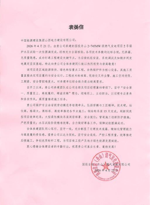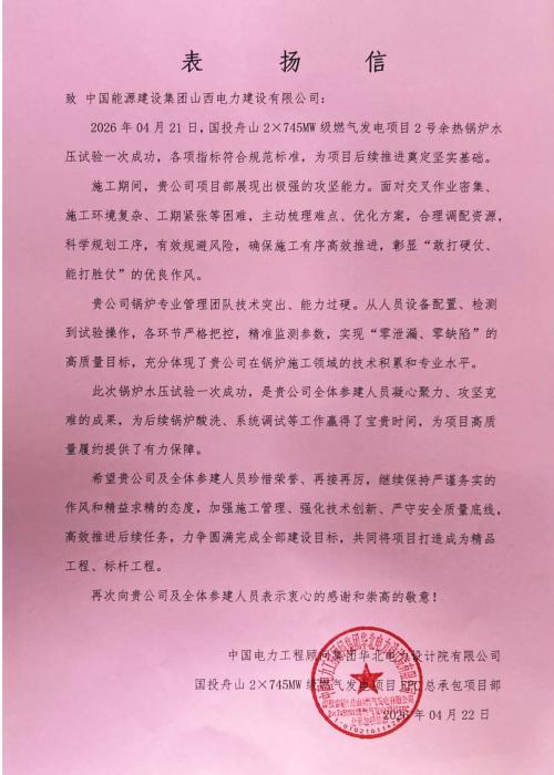 近日,中国能建山西电建承建的亚洲单机容量最大、效率最高的9HA.02型燃机国投舟山燃气发电项目2号余热锅炉水压试验一次成功,获得业主、总包方等单位高度赞扬。