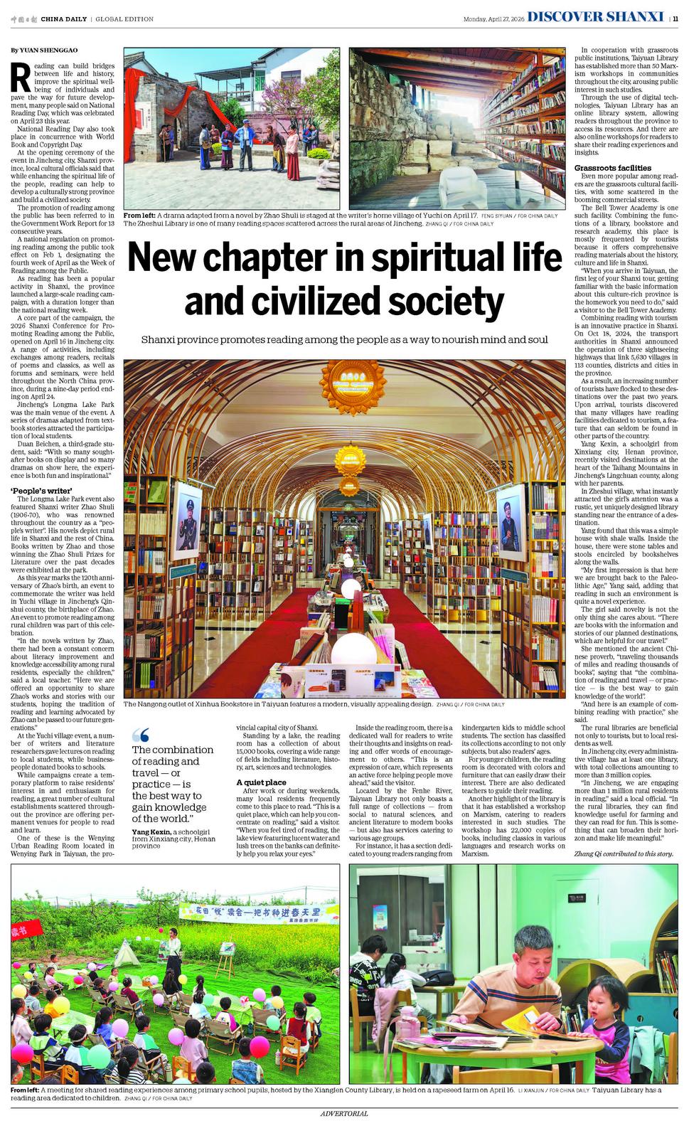 A core part of the campaign, the 2026 Shanxi Conference for Promoting Reading among the Public, opened on April 16 in Jincheng city. A range of activities, including exchanges among readers, recitals of poems and classics, as well as forums and seminars, were held throughout the North China province, during a nine-day period ending on April 24.