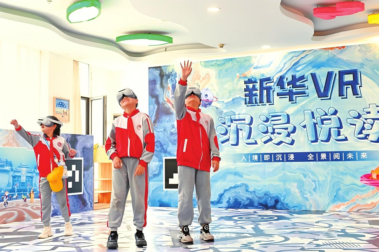 4月21日,山西新华书店图书大厦内,来自太原市迎泽区双东小学的孩子们正在体验VR沉浸悦读。日前,全省首家VR沉浸式阅读体验馆正式开放,读者可“化身”书中角色,通过3D音效、视觉渲染与触觉反馈的跨感官协同,在趣味互动中爱上阅读。王若渊摄